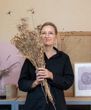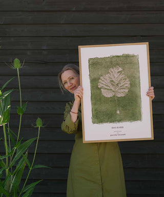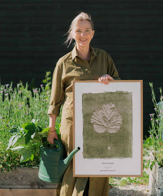 Pernille collects plants, flowers, and seaweed from her local surroundings in North Zealand, Denmark. These are selected on the basis of shape, leaf structure, characteristic or their symbolism. In her workshop, the fresh plants are carefully printed on paper through a hand-powered graphic press.